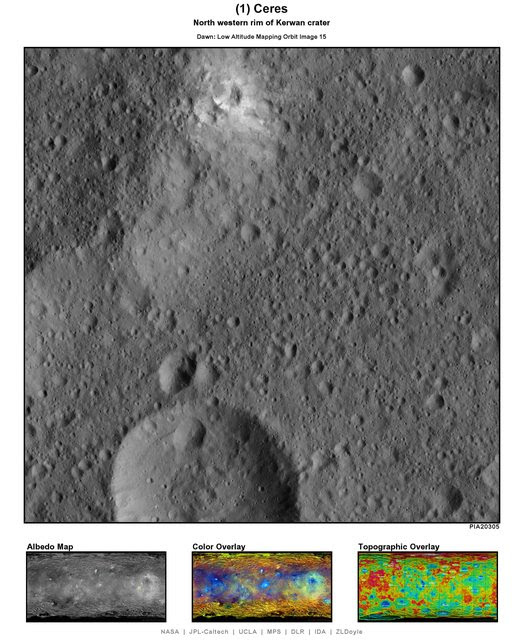 LAMO 15 features a short segment of the far northwestern portion of Kerwan crater. A large, approximately 2 kilometer diameter crater is draped in a large amount of the white material that has been linked to salt deposits. The pattern around the crater would suggest the bright material in this location may have been just below the much darker surface layer and was thrown about landscape after an object impacted the local area. The crater is also located directly on the rim of major crater, Kerwan. As noted in the Photojournal entry, the imaged region is centered at approximately 2.5 degrees south latitude, 112 degrees east longitude.